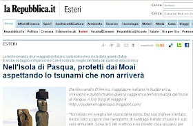 We are told that there is the chance that a tsunami may arrive here around 9 o'clock, but the island is two hours behind compared to Santiago and they don't tell us on what time zone we should rely. The clock on the TV screen is only good to get on our nerves. Apparently, only Anakena beach in the north east part of the island has seen a slight swell. The inhabitants of the coastal area were transported for safely reasons to the island's hinterland. Some tourists do anything they can to annoy the authorities and head for the beach because they "want to see the arrival of the waves." Some people still have the cellophane around their brain. Luckily the waves don't get here, they have already lost all their strength before being able to travel the 3700 km that separate us from the Chilean coast. The island does not even have time to fully awake, everything already came back to normal.